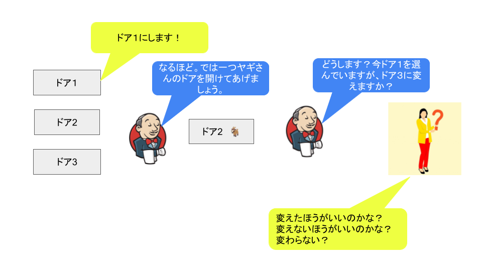 回答は1(ドアを変更)となります。当然だよね。というかたはもうこれ以降は読む必要はありません。