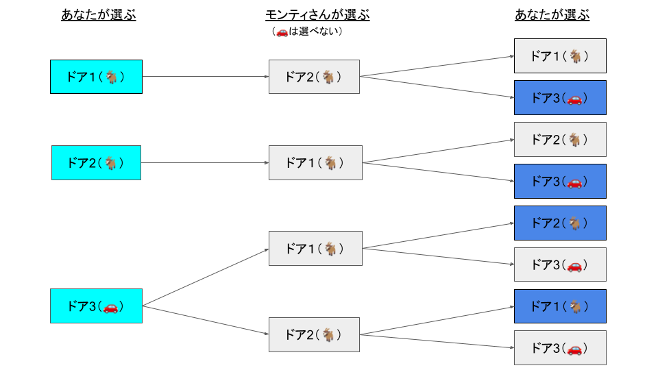 ここで注目すべきは、あなたがヤギのいるドアを選んだ場合、モンティさんは車のあるドアを選択できないという事実です。その場合、ドアを変更すると必ず正解となります。