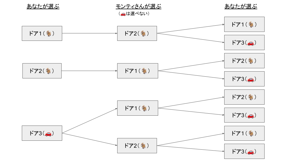 ヤギ、ヤギ、車は変わらないので、ドア1- ヤギ、ドア2- ヤギ、ドア3- 車の場合を考えてみます。