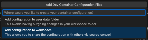 他の人にもDev Container環境を共有するため、Add configuration to workspace を選択します。