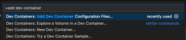 続いて、Visual Studio CodeにてCommand Palette (F1 または ⇧⌘P)を開き、Dev Containers: Add Dev Container Configuration Files... を選択します。