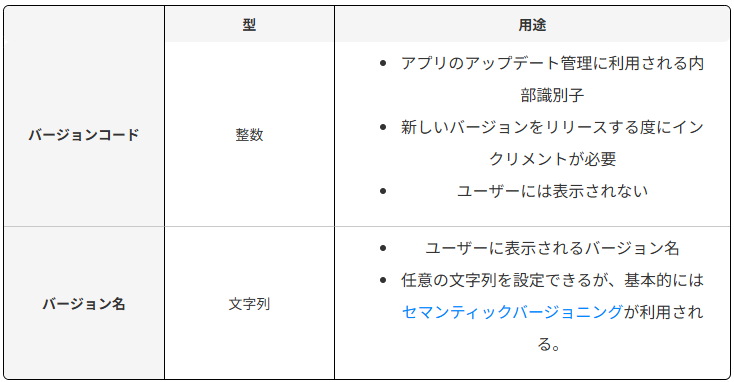バージョン情報は「バージョンコード」と「バージョン名」の2つで構成されています。