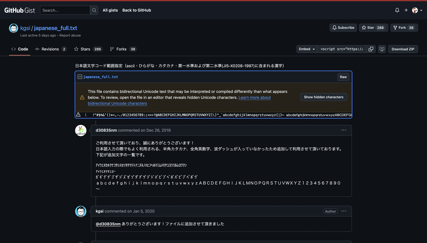 次に、日本語で使用する文字情報の一覧を取得します。こちらのサイトにアクセスし、日本語の文字コードの一覧をコピーしてください。ここで選択した文字が、Text Mesh Proで使用できる文字となります。右上の「Raw」ボタンを押すと文字コードの一覧が表示されますので、すべて選択してコピーしてください!