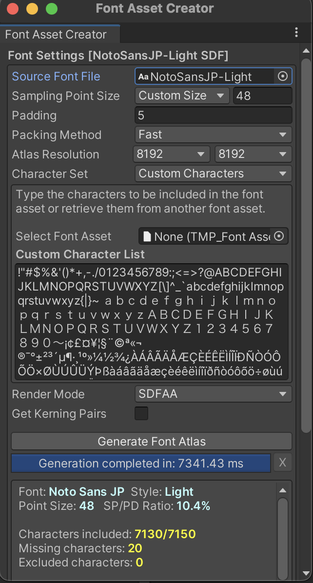 すると、以下のような画面が表示され、新規フォントアセットを作成することができます。各設定項目の詳細は、下記のテーブルをご確認ください!
