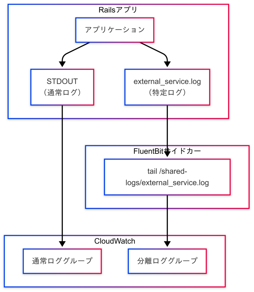 ログの分離出力は、開発・運用時のトラブルシューティングやログ保守・可視化の観点で非常に有用です。今回は、Railsで外部サービスとの連携ログをexternal_service.logに出力し、これをサイドカーのFluent BitコンテナでCloudWatch Logsに送信する構成を作ってみました。