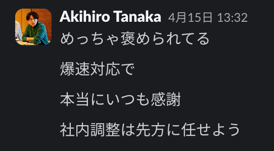 ある日の商談中のSlackスレなのですが、良好な関係性が少しでも伝わればと思います。