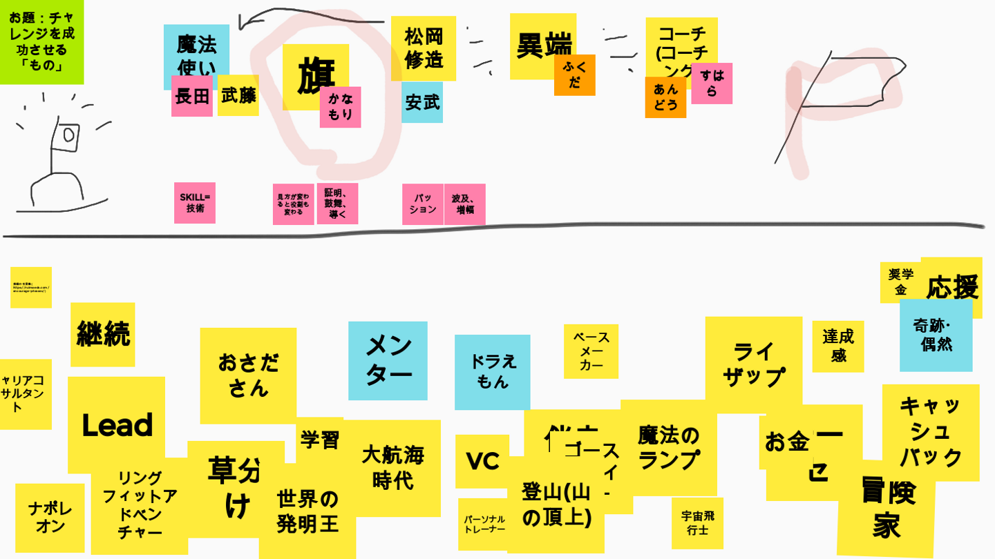 ▲「チャレンジを成功させるもの」というキーワードをもとに、役員を含めてブレスト。「旗」が見えてきたぞ…!