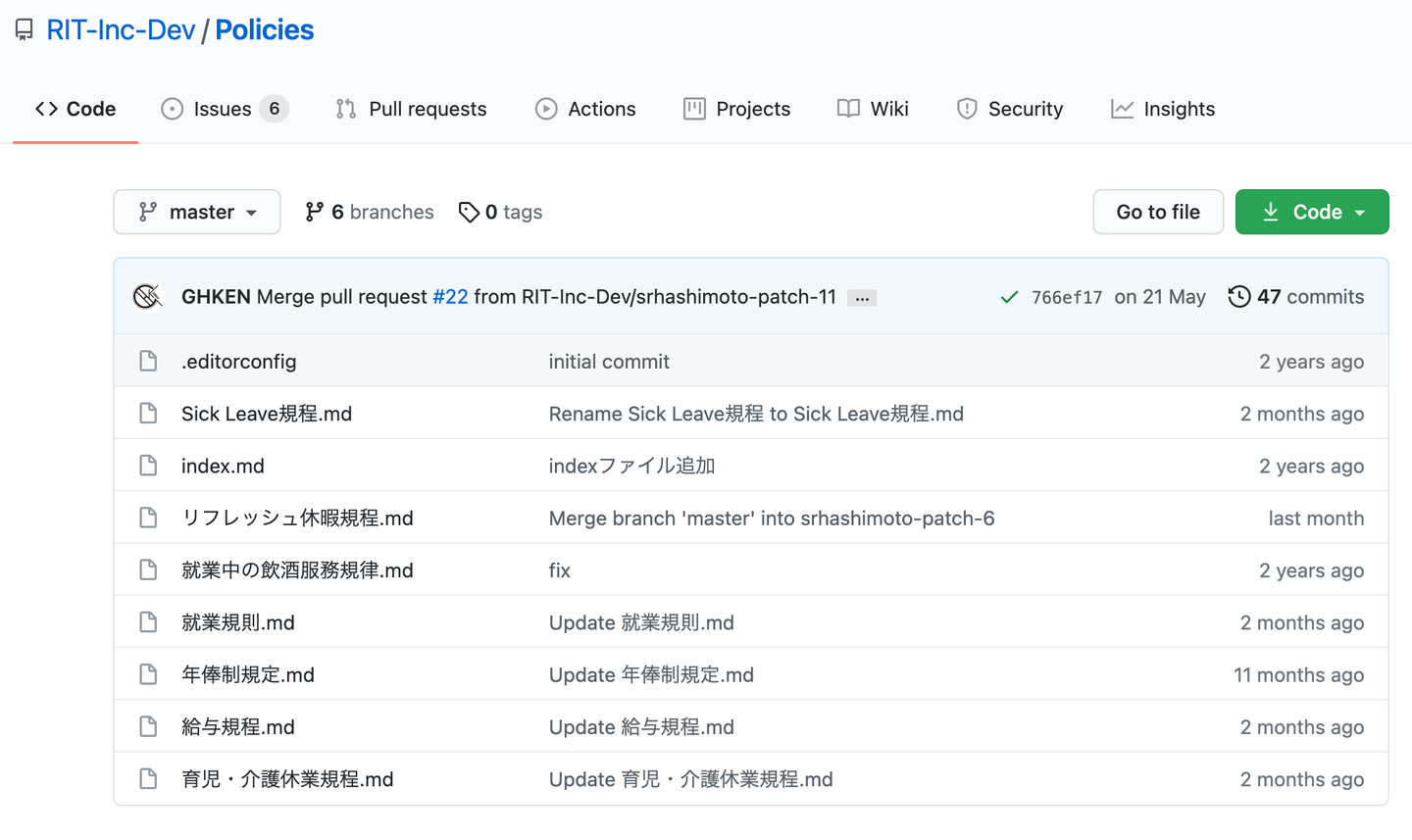 RITでは「就業規則は特段秘密にしなければならない理由もなく、むしろ新しくジョインしようとする人が入社前に規定を把握できればアンマッチの防止になる」(CTOインタビューより抜粋)という考えから就業規則をgithubで管理、オープンにしています!