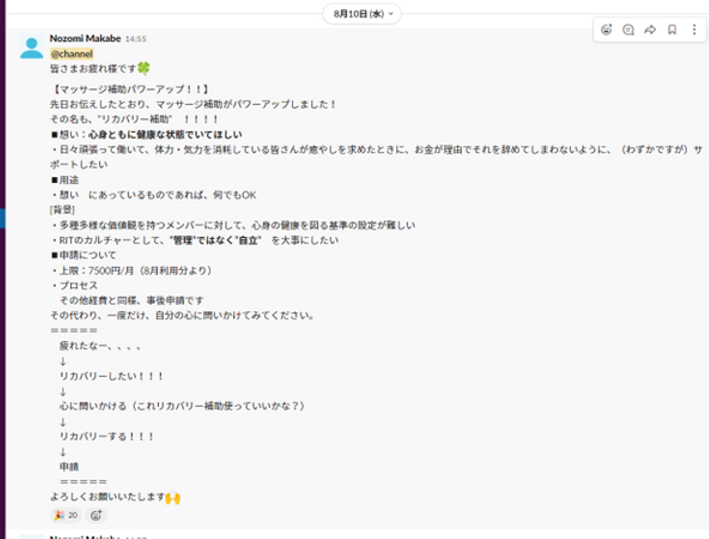 リカバリー補助を社内にアナウンスした時のSlackの実画面です。