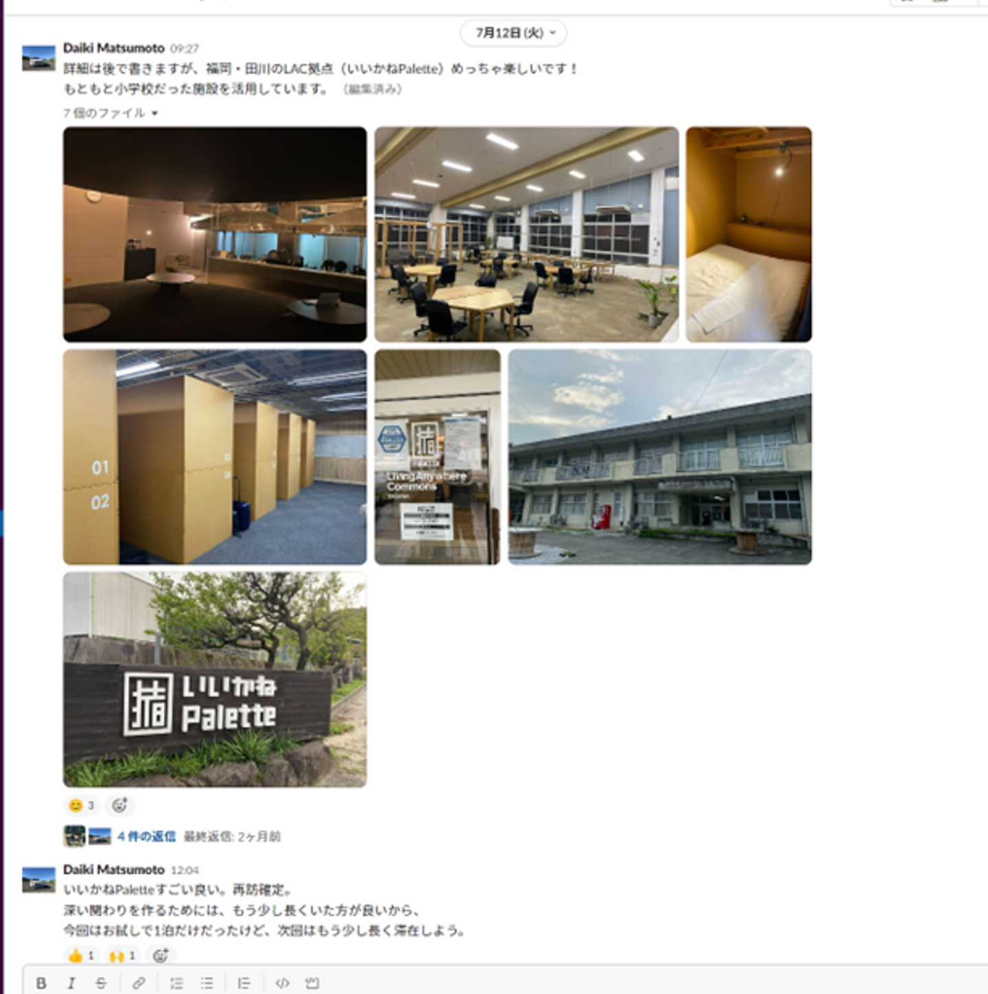 はい、とてもシンプルなので、みんなにどんどん使ってもらいたいです。交通費も何か目的であったり理由があれば、出張費として申請できますよ。slackでもLACを利用したワーケーション専用チャンネルがあり、情報共有の場として利用した人が写真やレポートを投稿していますよ!