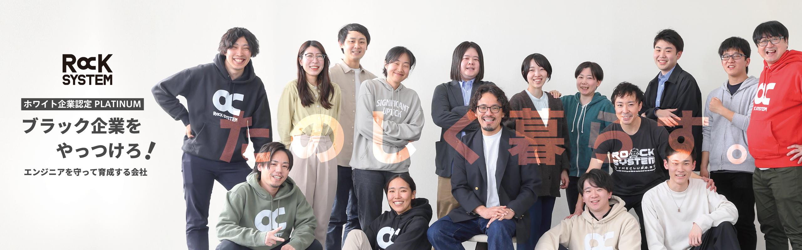 「きつい・厳しい・帰れない」と言われてきたIT業界を変える! ロックシステムでは「ブラック企業をやっつけろ」をスローガンに、最小の労力・時間で最大の成果を出せるように、業務の効率化・最適化に取り組み続けています。 現在ではすべての従業員が残業ほぼゼロを達成。 2023年からはホワイト企業認定最高ランクのPLATINUMを取得。 世界を変えるのもいいけど、まずは自分の暮らしを楽しく変えていこう。 そんな思いで、働くエンジニアに最大限還元できるような制度を多数用意しています。