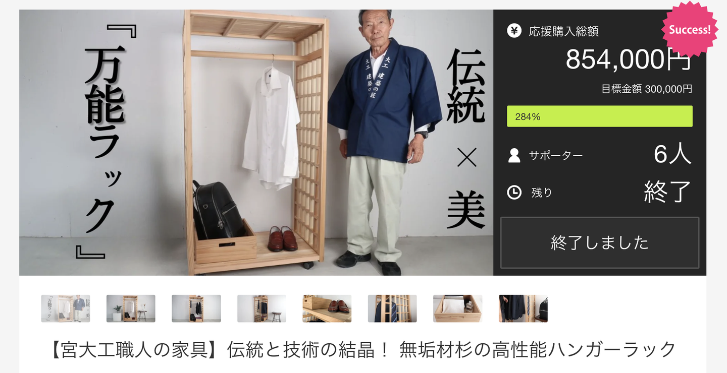 棟梁を応援しファンとなる声は多く集まっていたので、家という購入機会の少ない商品だけではなく、もっと多くの方に棟梁の技術や商品を実感してもらいたいと考え、購入機会の多い家具やインテリアを販売してみることにしました。そうすることで、既存のSNSのフォロワーに対しても直接アプローチすることができると考えたからです。また、「伝統技術を残していって欲しい」との実際のフォロワーからの声も多かったため、クラウドファンディング(Makuake)で販売することにしました。