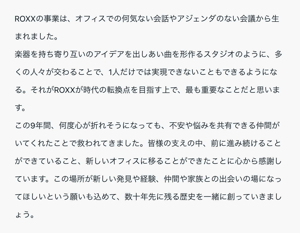 ROXXが歩んできた歴史を重んじながら、「時代の転換点を創る」というミッションを胸に、革新的な進化を遂げるために創られたオフィスです。