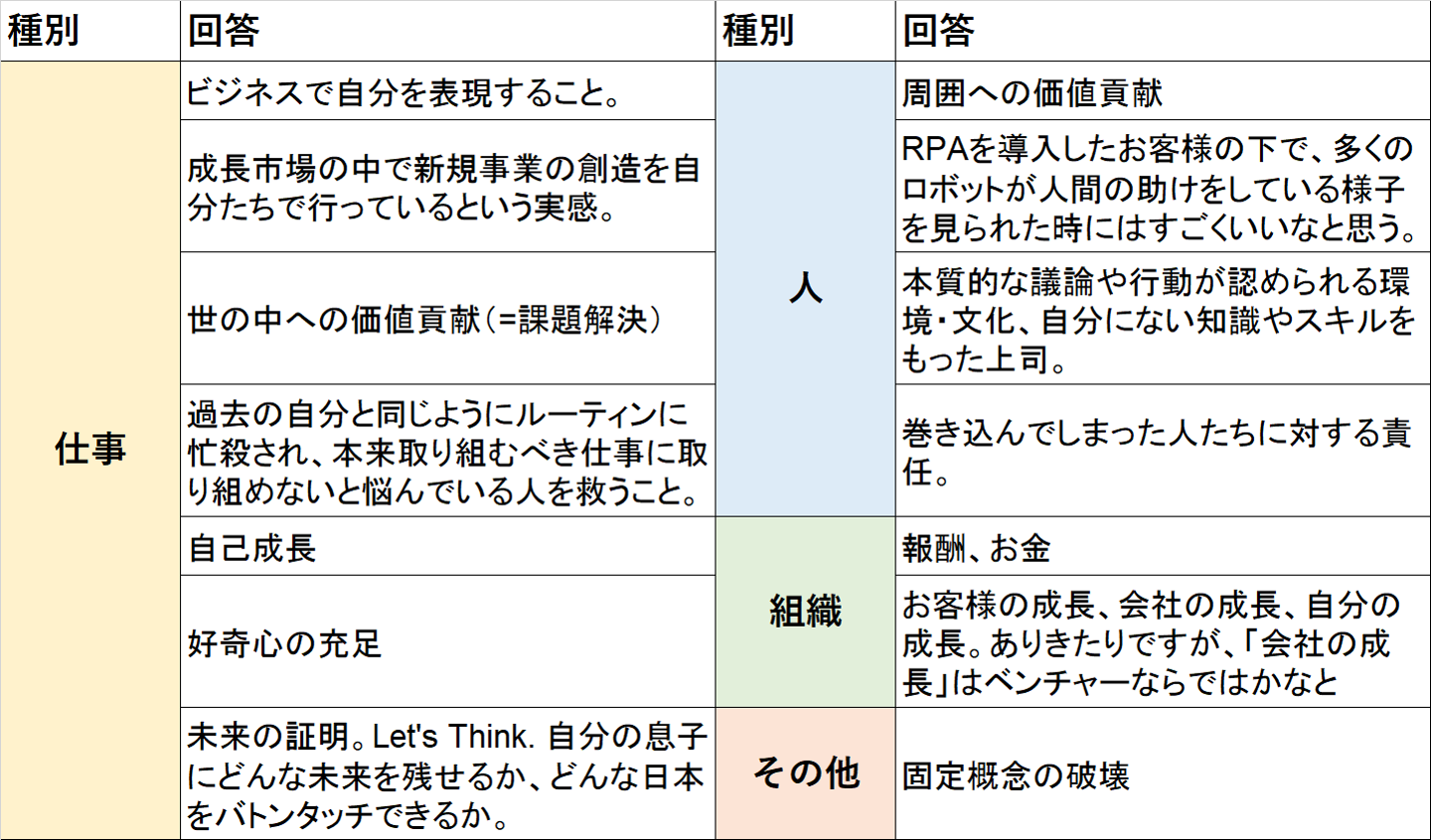 こちらも得られた回答を大別し、一部を抜粋しています。回答数としては、仕事内容や仕事の目的、仕事によって自分が得られるものをモチベーションにしている人が突出して多かったです。中でも、自分の成長と世の中への貢献や影響を挙げる人が目立ちました。次いで多かった回答は、職場の仲間やクライアントを挙げたもの。さらに、会社の成長やお給料と続きました。働くモチベーションは様々ですが、仕事自体に魅力を感じている人がやや多い傾向にあると言えます。