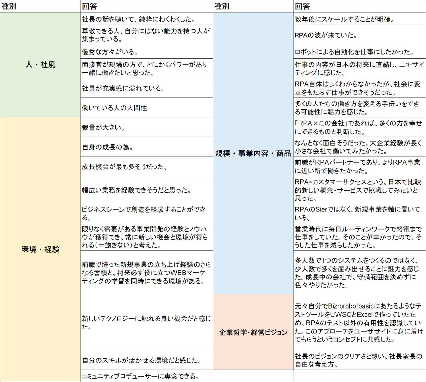 当社で働く人たちは、どのような動機で働き始めたのでしょうか。ズバリ、自由記述式で聞いてみました。