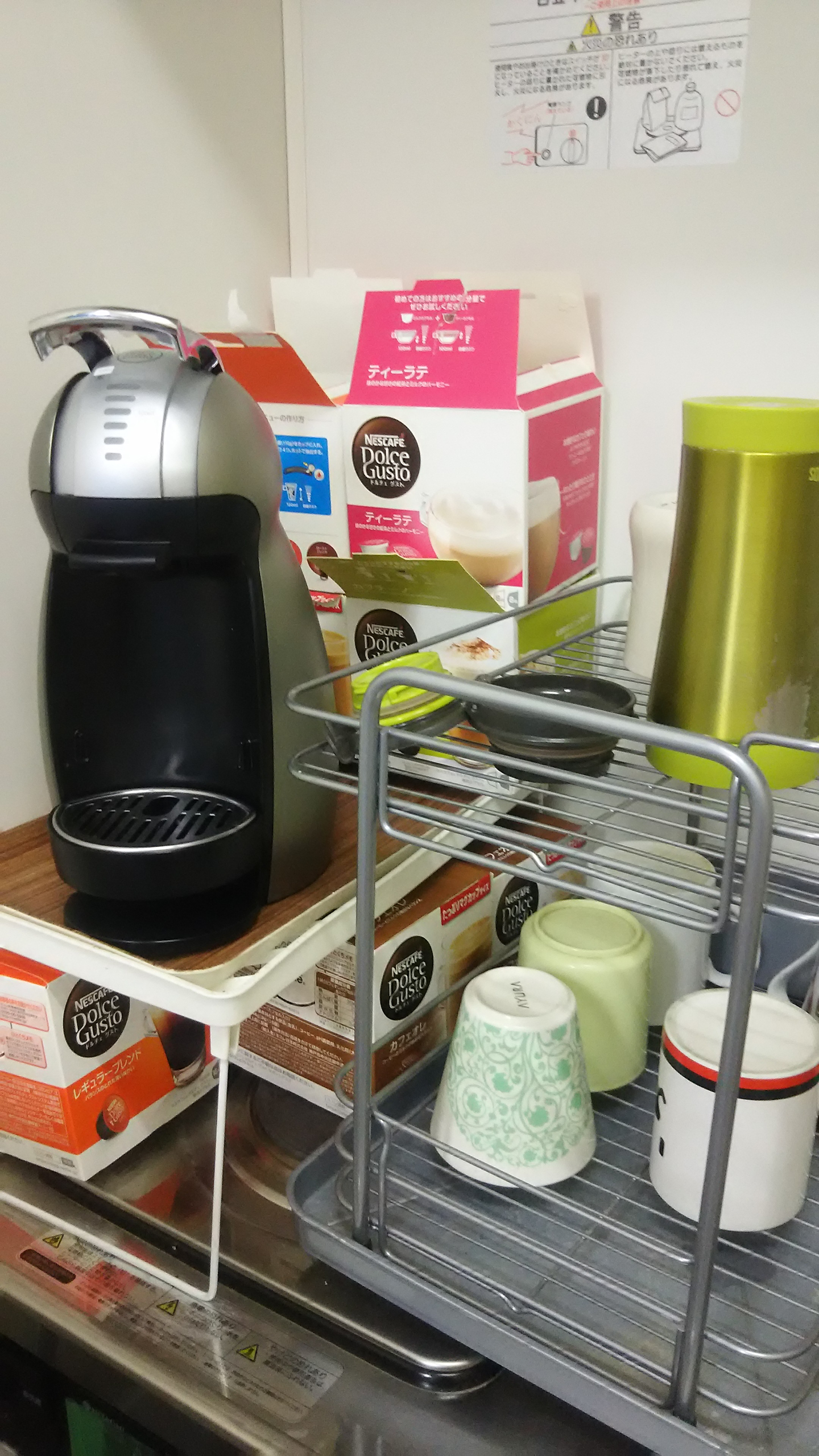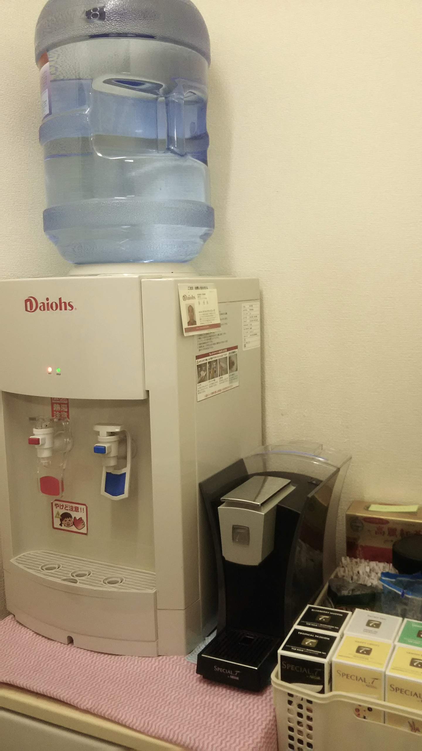 ↓は給湯室です。お水・お湯・コーヒー・紅茶・ジュース・スープが飲み放題になっています。