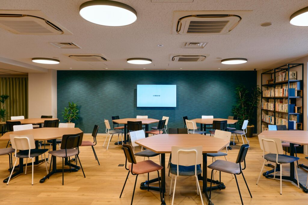 劇場型会議室の隣にある「サロン」は、木調の落ち着いた雰囲気で、大型モニターを備え、グループワークから十人単位での勉強会を開催しやすい空間です。社内で定期開催している社会勉強会の会場としても活用しています。