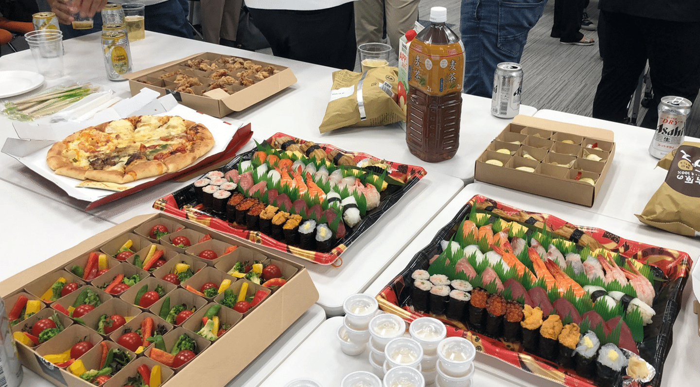 社内の懇親会でもよく発注している、少しおしゃれなケータリングをはじめ、ピザ、お寿司、お菓子などを揃えました。