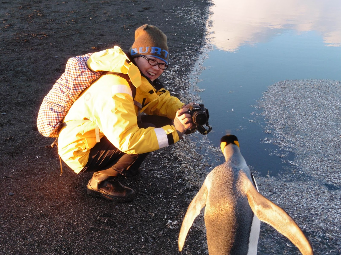 ▲亜南極にあるサウスジョージア島に上陸した際の様子。写真を撮影していたら、好奇心旺盛なペンギンが近づいてきてカメラをつつこうとする瞬間(本人提供)