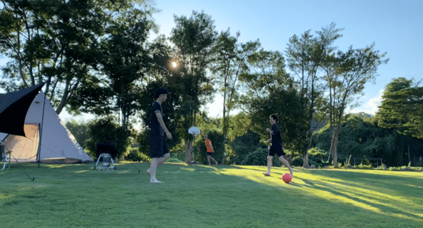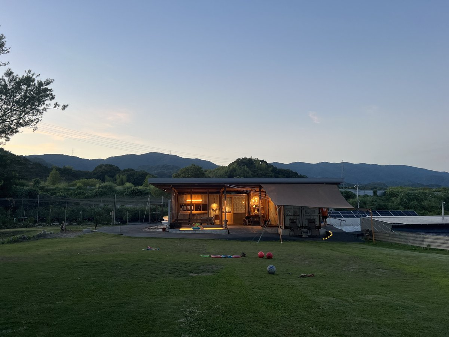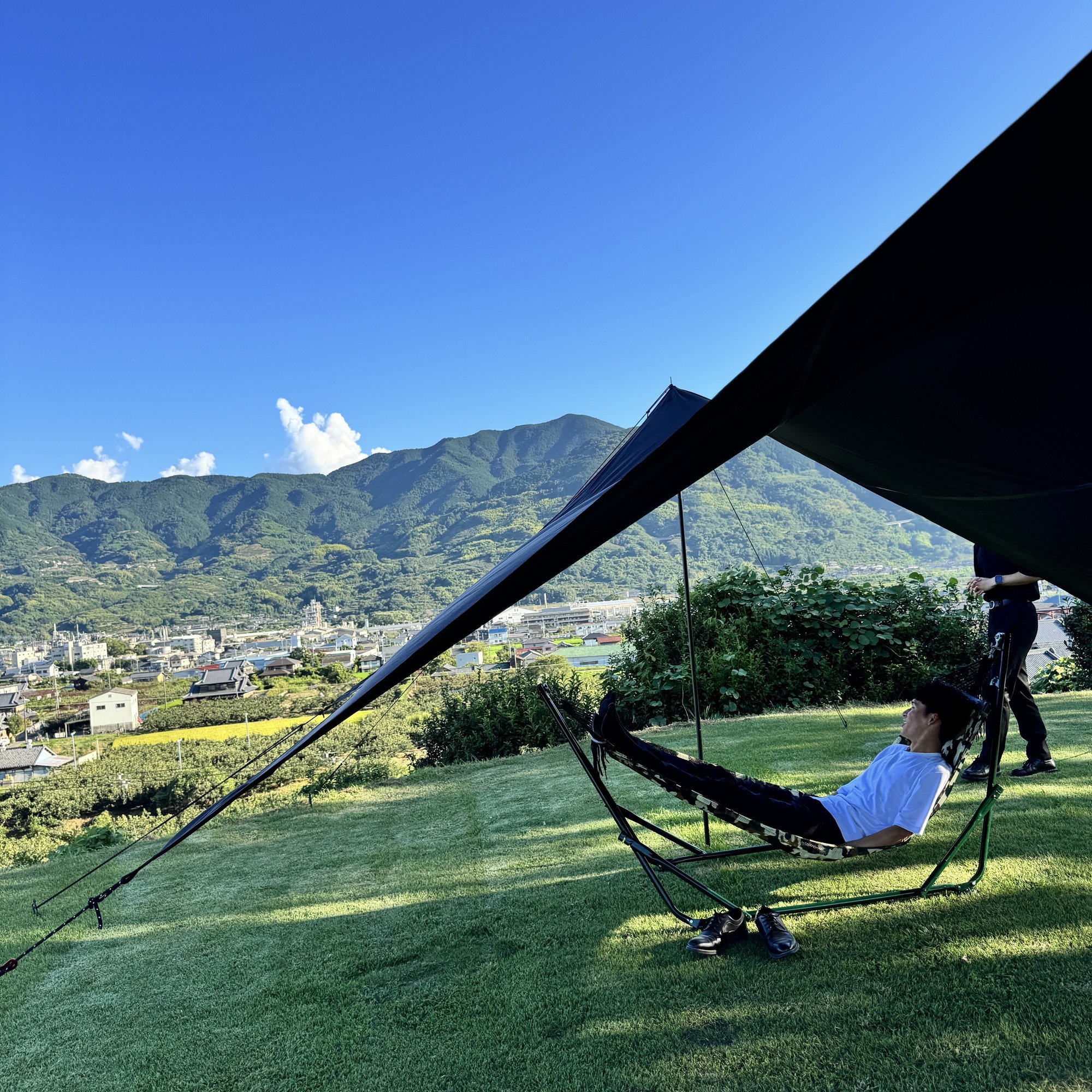 「くつろぎたいのも山々」さんは、絶景と夜景が楽しめるファミリー向けキャンプ場です。一部サイトは裸足で歩きたくなるような芝生になっています。実際にほとんどのメンバーは裸足で過ごしました。また、清潔な設備や授乳スペースが整っています。収穫体験や烏骨鶏とのふれあいなど、子どもが夢中になる体験も豊富で、大人はゆっくり過ごせるのが魅力です。
