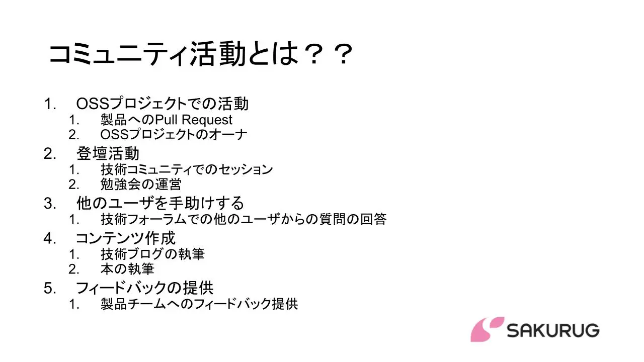 そういった貢献をしていくのがいわゆるコミュニティ活動です。