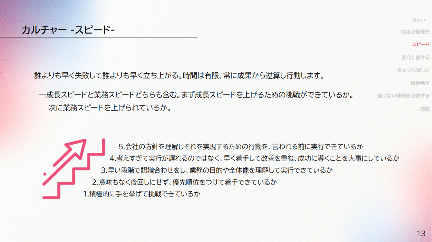 サクラグのスピードというカルチャーの補足として、「誰よりも早く失敗して誰よりも早く立ち上がる」というのがあります。どれだけ早く挑戦して失敗するか、本当にそこに繋がるなと思っていて。