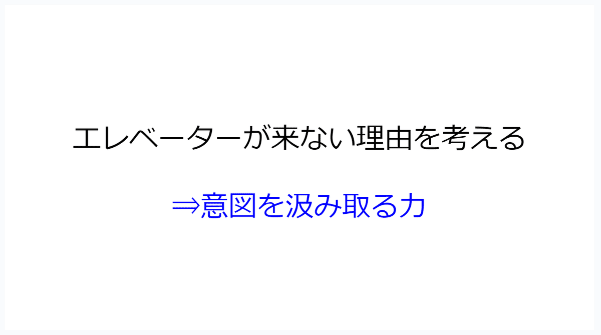 今回お話したいことの一つ目は、「エレベーターが来ない理由を考える」というテーマについてです。例えば、自分がエレベーターのボタンを押して待っているのに全然来ないとき、皆さんはどう感じますか?