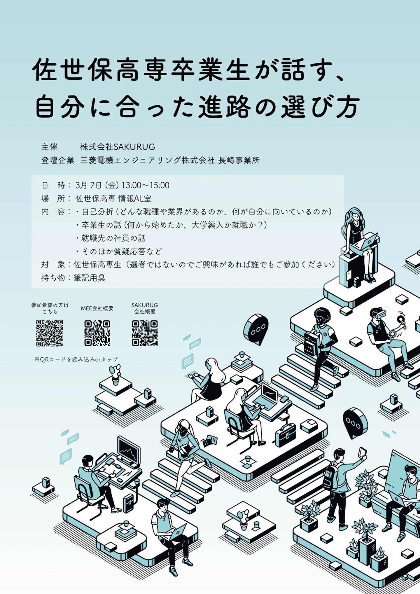 Seo:3月7日の午前には、僕の母校である佐世保高専で、キャリア教育イベントを実施しました。三菱電機エンジニアリング株式会社 長崎事業所様にご協力いただき、来年度に就職活動を控える学生の皆さんに向けて、自己分析を中心としたワークショップと、OBの方々による講演を行いました。