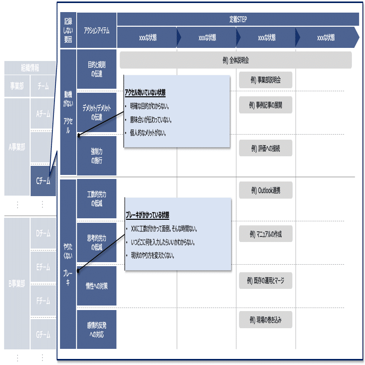 私たちは、組織の変革度合いを「定性(状態)」と「定量(数値)」の両面で必ず定義します。