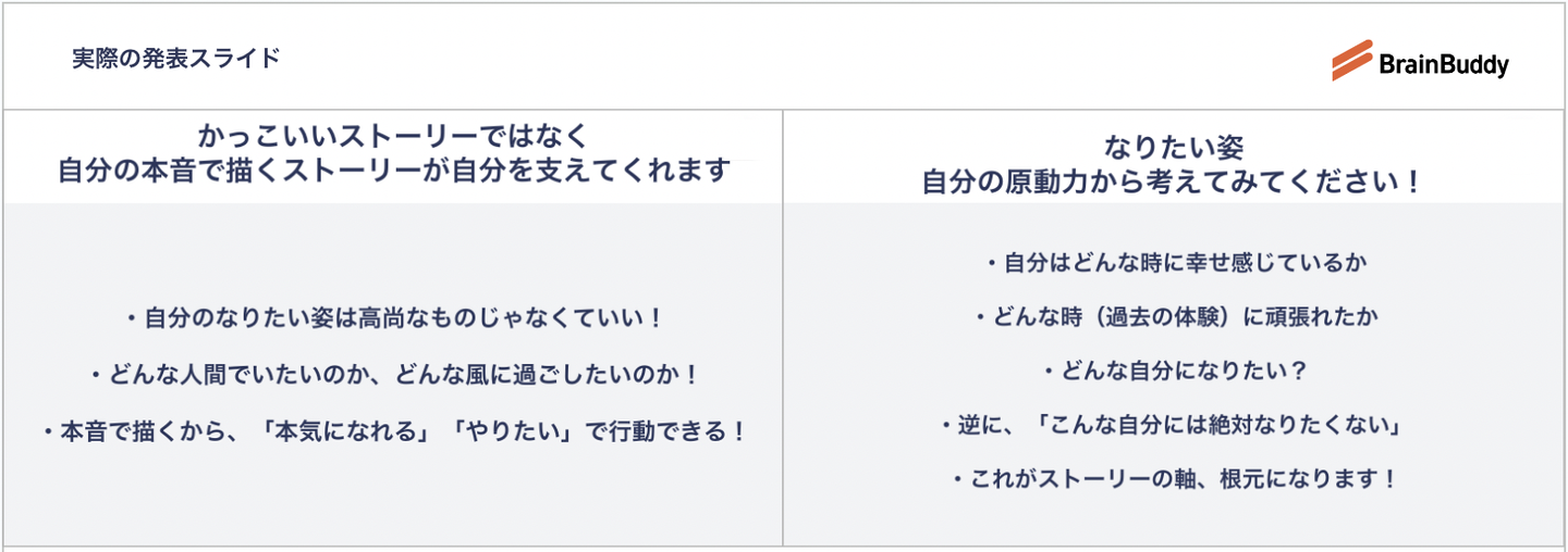 このままでは「仲間と一緒に働くこと」がブレーンバディにいる目的になっていたため、ひで(創設者の一人で弊社のCHRO)から「最終ゴールとして自分がブレーンバディや人生を通じて成し遂げたいことを掲げた方がいいよ。」という話をしてもらいました。