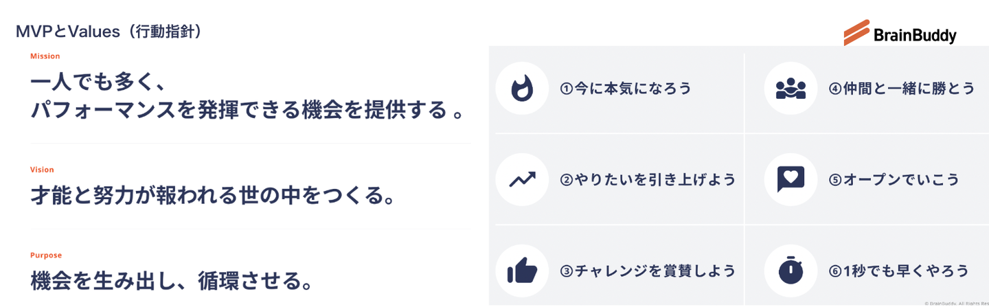 ブレーンバディの6valuesを意識して臨むことで、一人一人がキックオフを起点にマインドや行動を変化させ、ブレーンバディが掲げるMission・Visionを実現していくことを目指しています。
