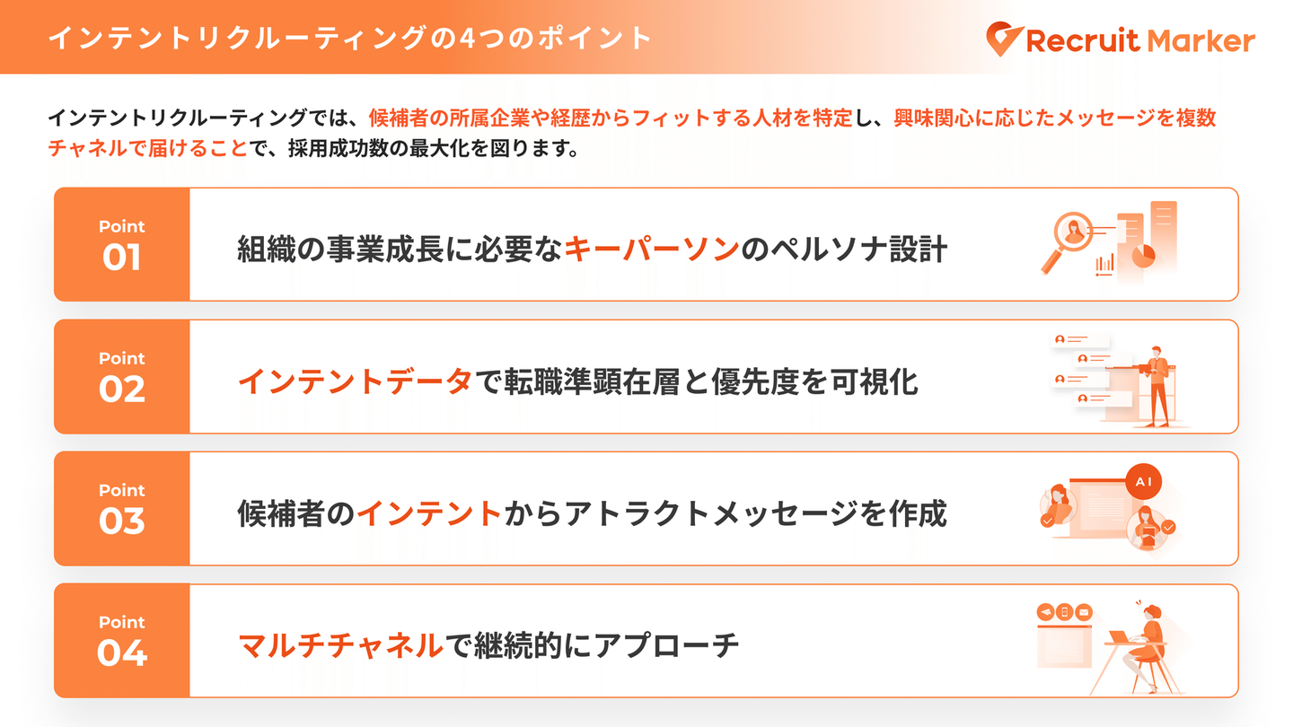 Recruit Markerは、候補者のインテント(実現したいキャリア)に基づき、最適なタイミングとチャネルで自動アプローチを行うリクルーティングのAIエージェントです。従来の採用手法は、求人広告か人材紹介、あるいは転職媒体でのスカウトという“三択”が主流でしたが、「それだけじゃ採れない」と悩む企業は非常に多い。そこで、『Recruit Marker』は、独自の概念である「インテントリクルーティング」の4つのポイントを通じて、誰よりも早く“隠れた優秀層”を見極め、最適なアプローチで出会いにつなげることを支援します。