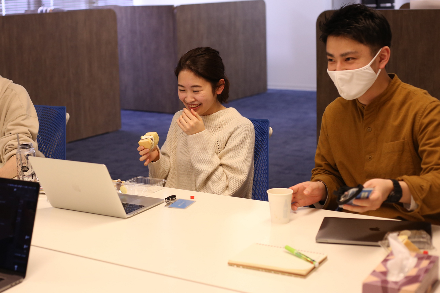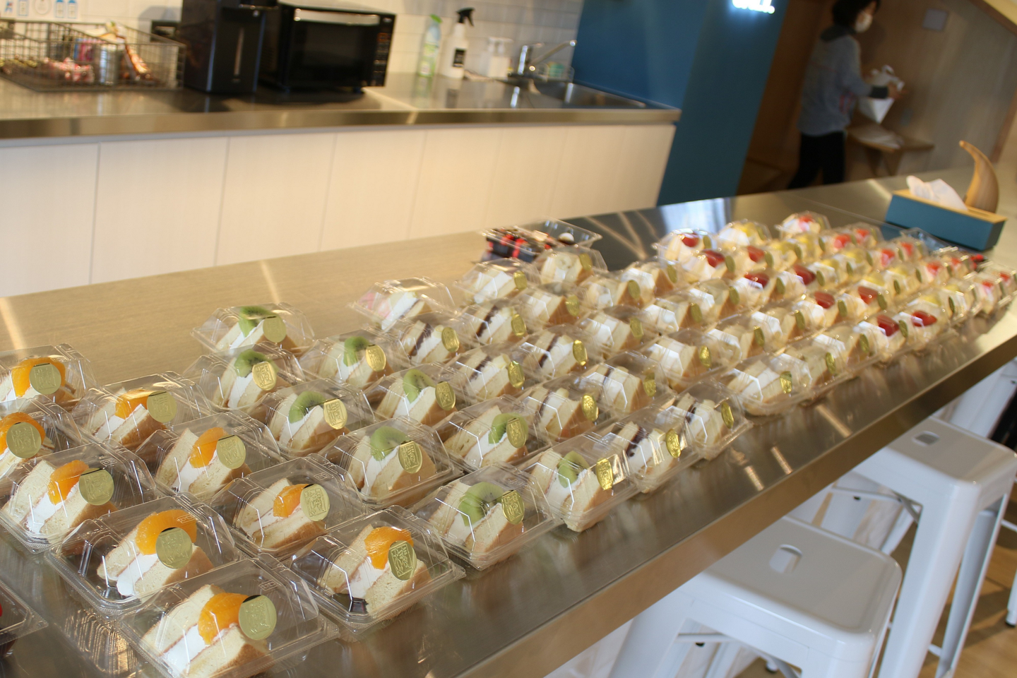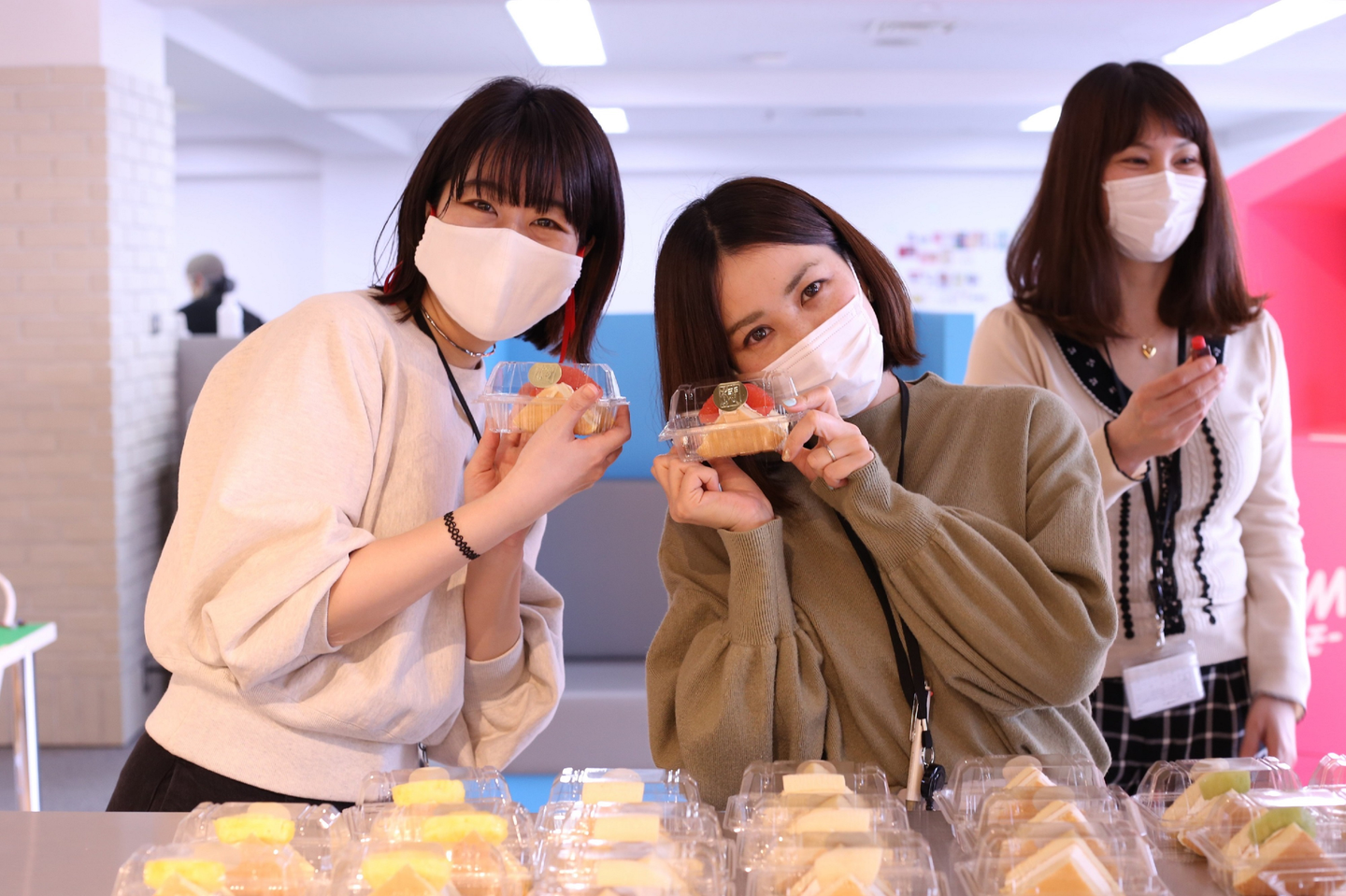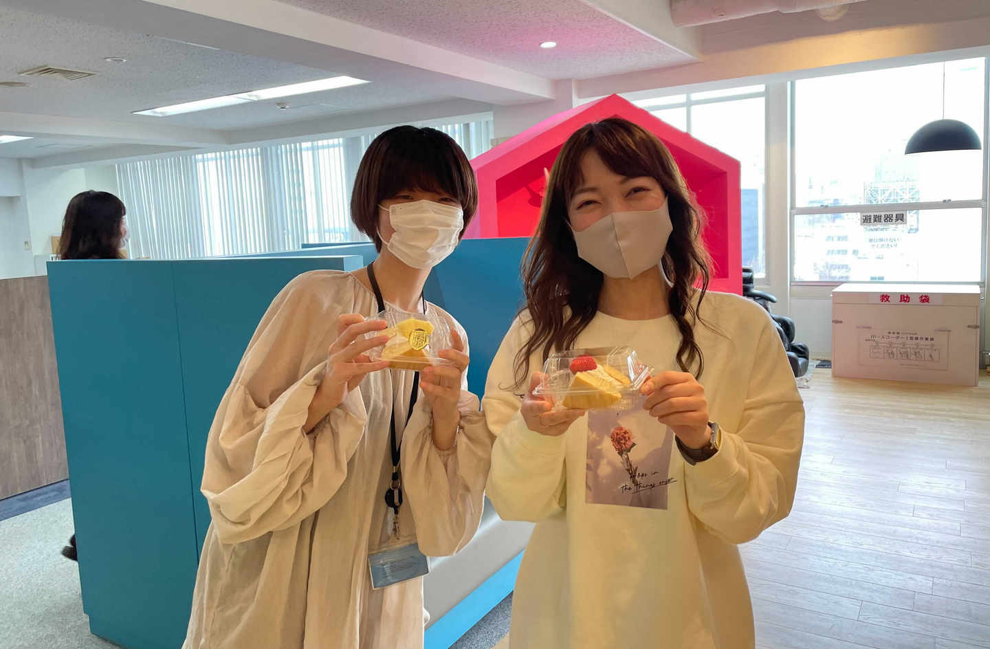 イチゴやキウイ、餡バターなど7種類の味が揃い、全スタッフ分がズラリと並べられました。たくさんの数をしかも個包装で手配してくれた総務の皆さん、ありがとうございます!