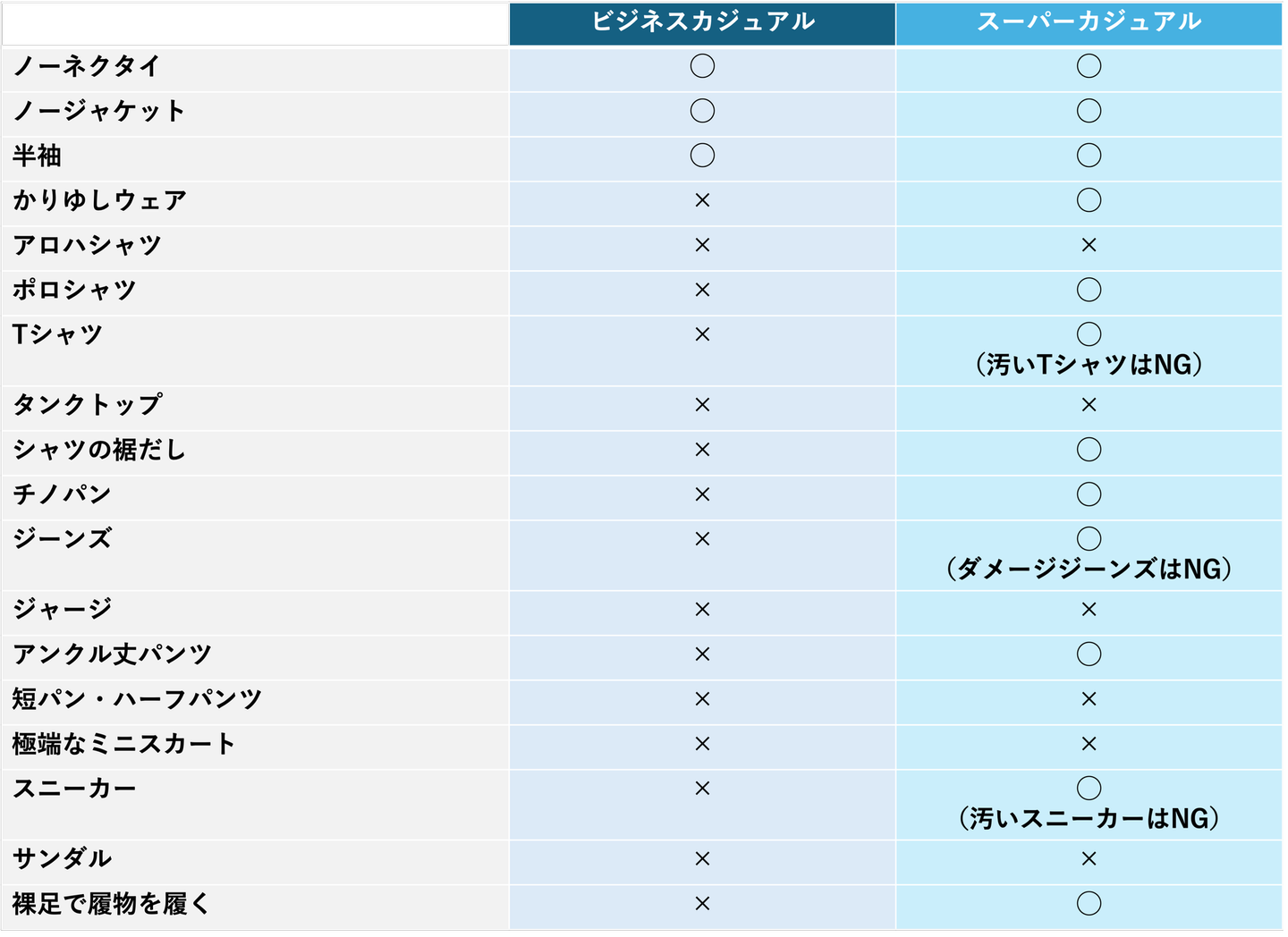 S&Iでは、年間を通して、スーパーカジュアルを適用しています。ビジネスカジュアルと比較した一覧は以下となります。