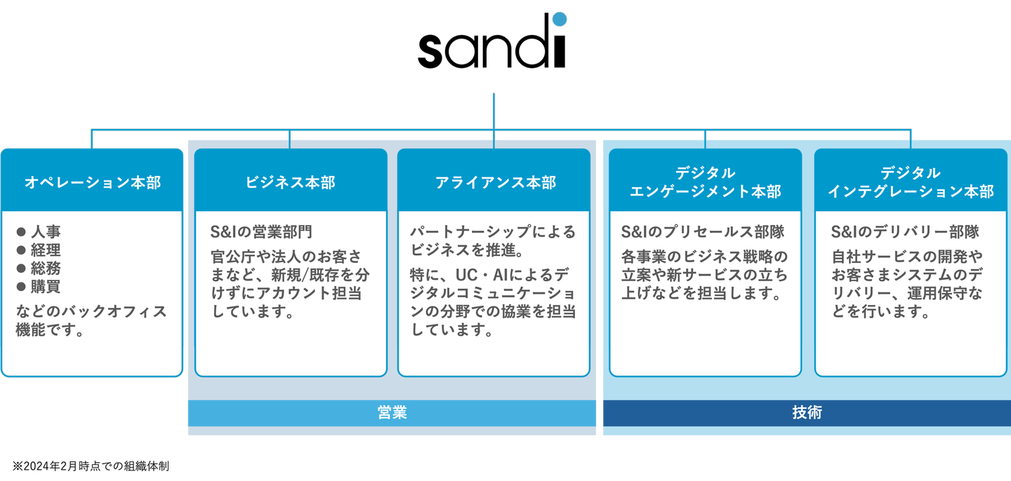 S&Iの現在の組織は、「オペレーション本部」「ビジネス本部」「アライアンス本部」「デジタルエンゲージメント本部」「デジタルインテグレーション本部」の5つの本部で構成されています。