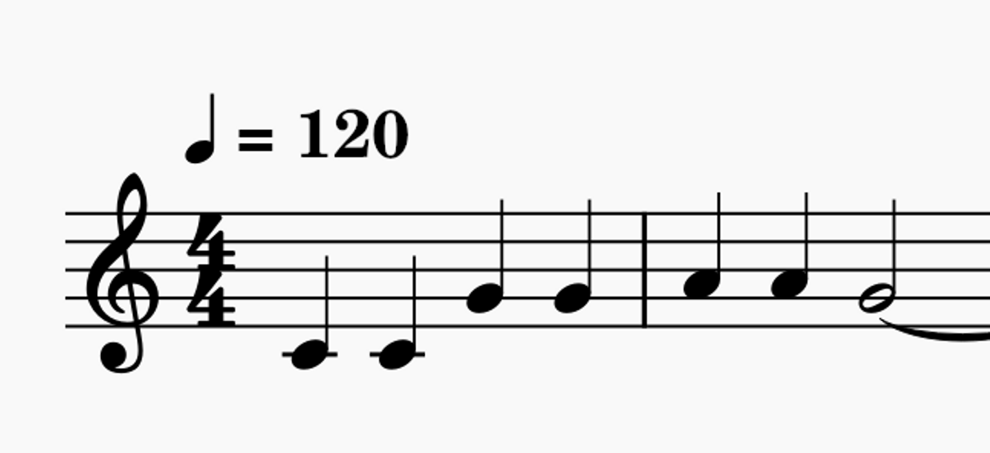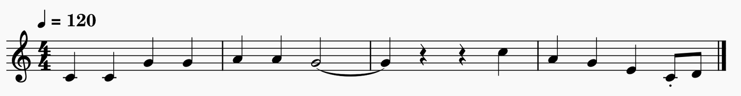 きらきら星の初めは、四分音符のド、四分音符のド、四分音符のソ、四分音符のソ、四分音符のラ、四分音符のラ、ニ分音符のソ・・となっています。