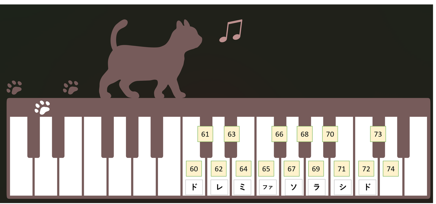 「60」は「ド(正確にはC3と言われる高さのド」の音を示しています。半音ずつ上がっていくにしたがって対応する数字ひとつづつ増えていきます。例えばここを「67」とすると、「ソ」から始まるという意味になります。( https://season-freeillust.com/About.html のかわいい鍵盤イラストを利用させていただきました。)