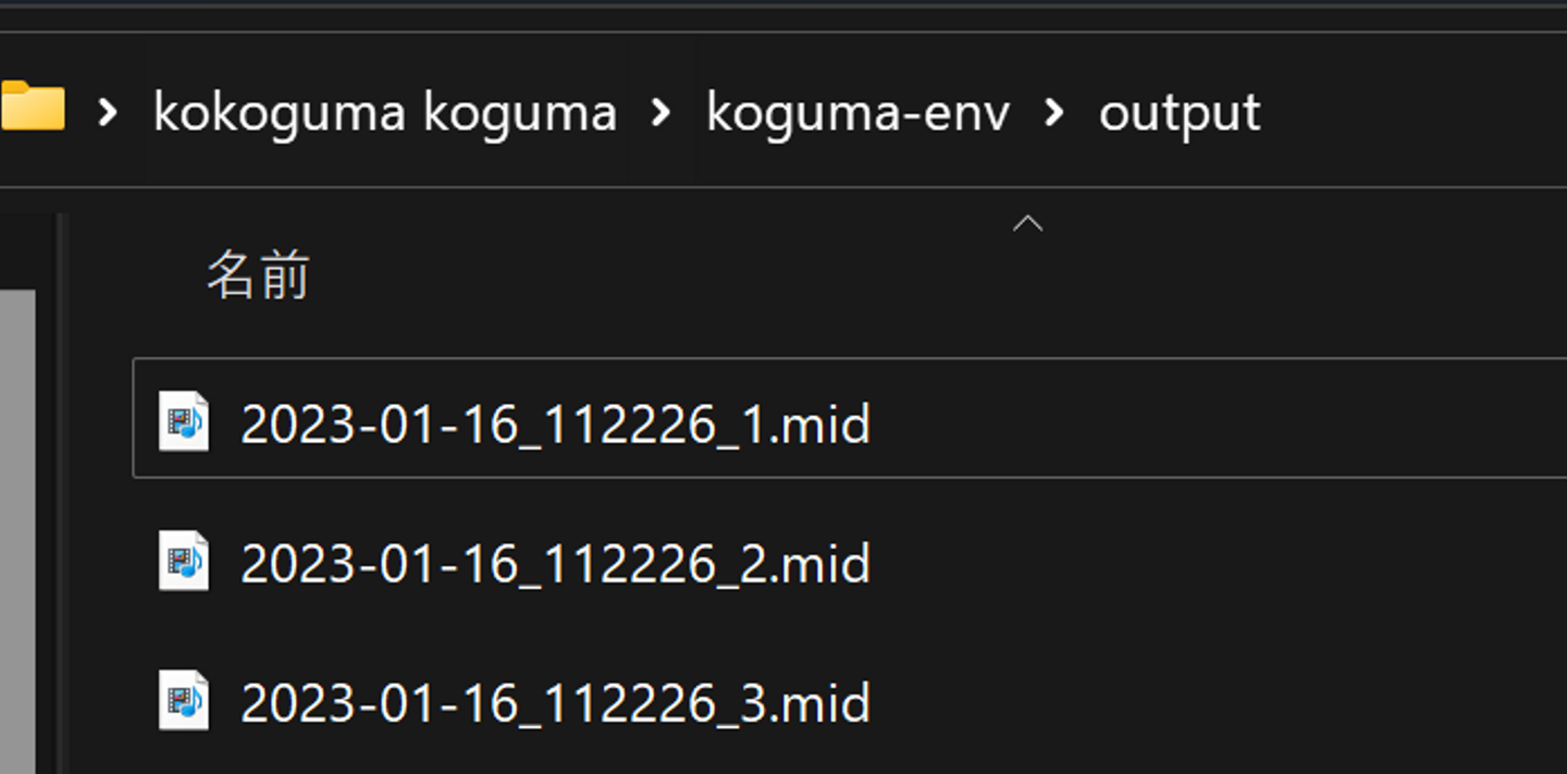 さて、コマンドを実施すると、出力ディレクトリ(--output_dirで指定したディレクトリ)配下に3つのファイルが出来上がります。これらは演奏情報を記録したMIDIファイル(.mid)と呼ばれるもので、WindowsMediaプレイヤーで再生すればピアノの音で確認できます。