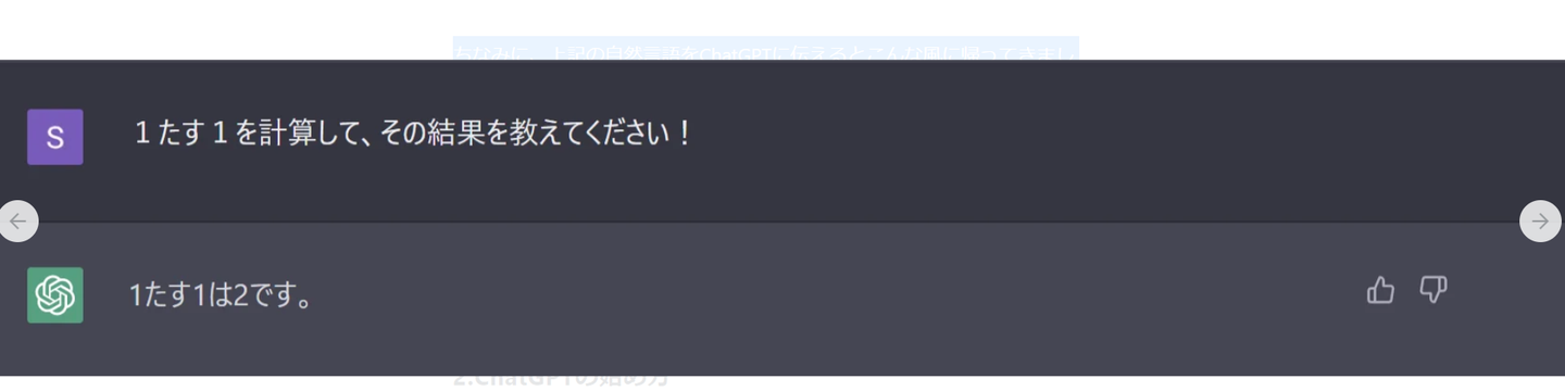 console.log(C); //2 ちなみに、上記の自然言語をChatGPTに伝えるとこんな風に帰ってきました。さすがですね!「たす」を「+」にしないところも好感が持てます!