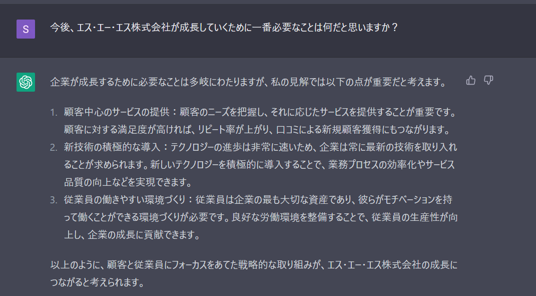 最後にチャットさんに、SASが今後成長するために必要なアドバイスを頼んでみます。