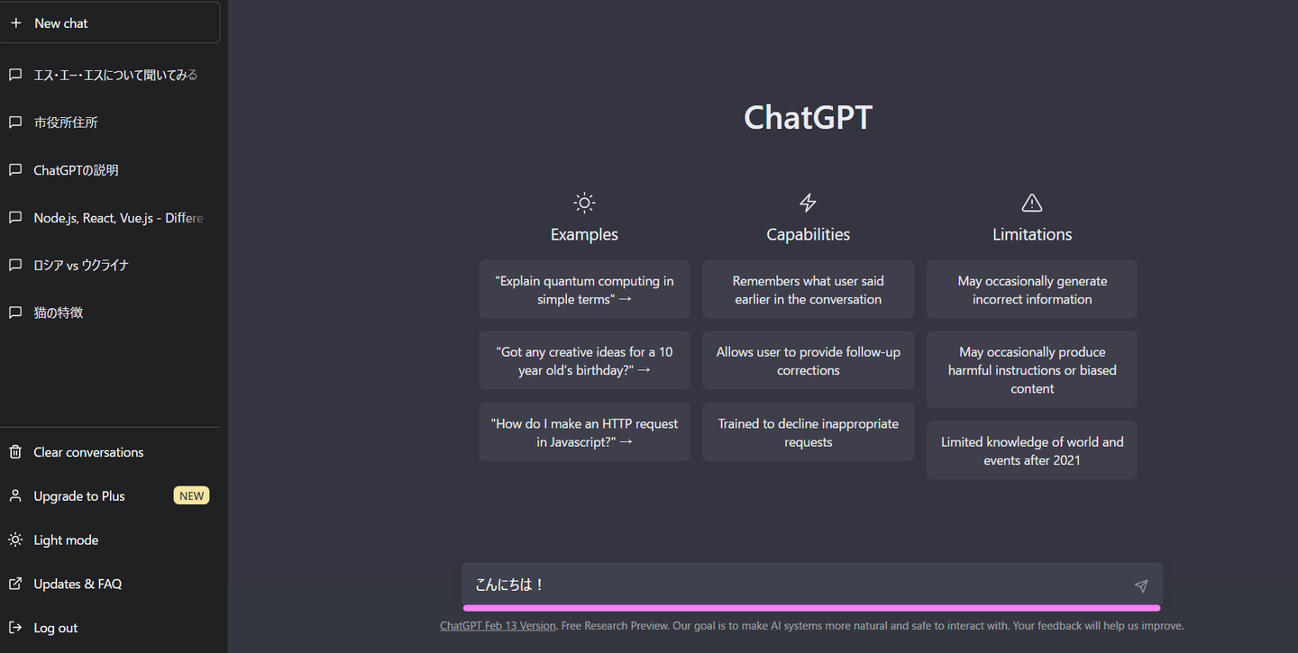 導入としてはこれだけです。話題を変えたいときは、左上の 「New chat」 から新しいチャットルームを作ることができます。 過去のチャットルームは左側に羅列 されているので、そこから続きを始めることもできます。