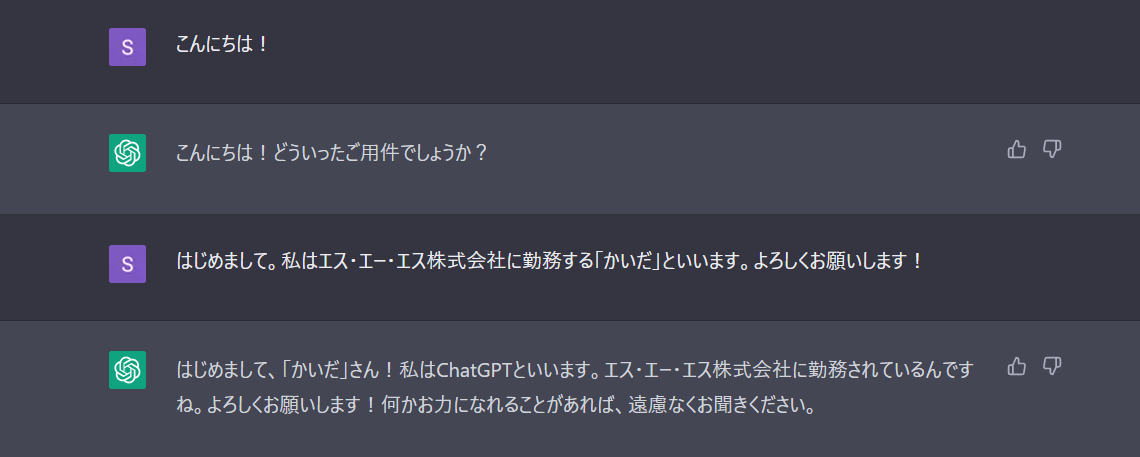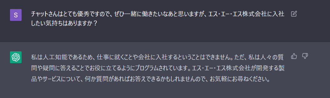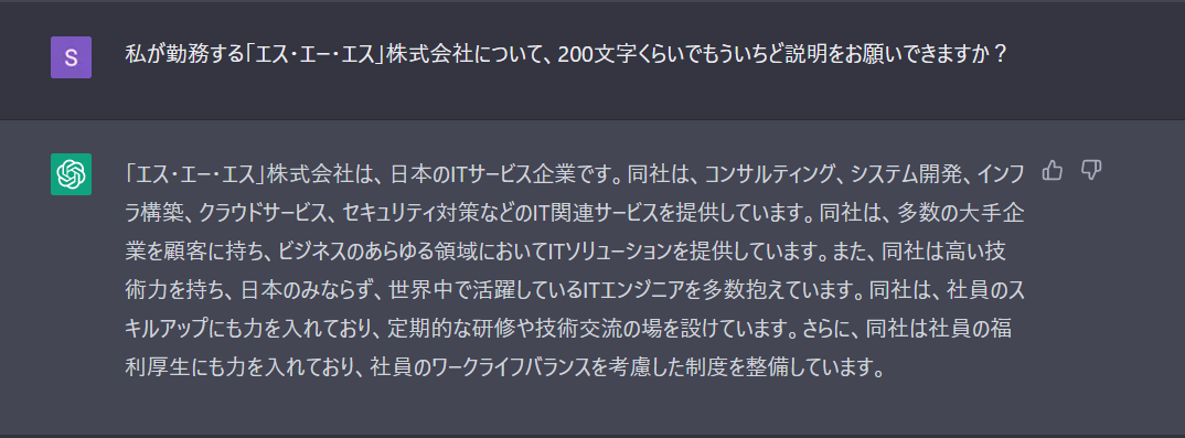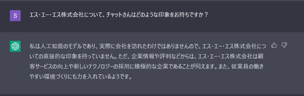 せっかく会社のTechBlogなので、このChatGPTを使って、 「エス・エー・エス株式会社」 についていろいろ聞いてみました。 果たしてAIチャットは、SASのことをどれだけ知っているのか・・!