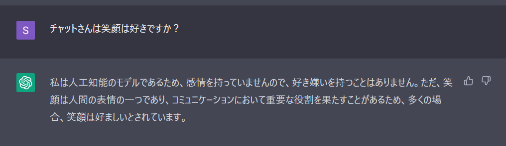 なるほど・・・AIは感情を持たないので、好き嫌いはないのですね。。しかし笑顔は好ましいとされている・・と認識しているようです。