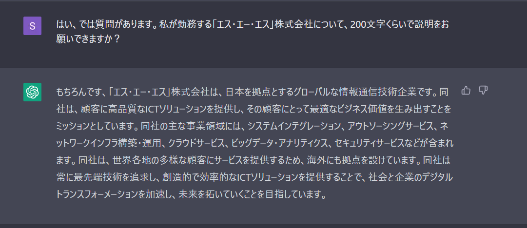 4.会社のことを聞いてみよう! チャットさんに、「エス・エー・エス株式会社」のことを聞いてみます。