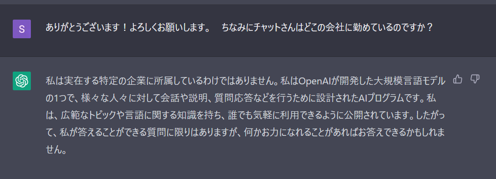 チャットさんは、自分がAIプログラムであることを認識していて、現時点で特定の企業に所属しているわけではないとのことでした。