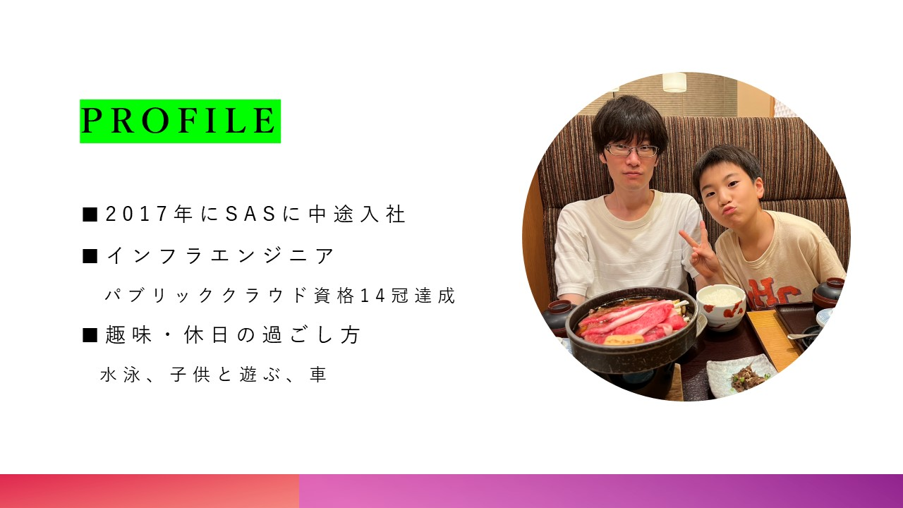 前職では残業が非常に多く、子供が産まれたこともあり、妻から働き方をもう少し考えて欲しいと言われてしまい、転職サイトに登録してたまたま目に入ったのがSASでした。 評価制度もしっかりしており、ライフワークバランスを大切にしていることに惹かれ、SASに転職を決めました。
