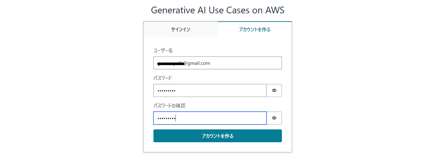 サービス構築できたら実際に使ってみましょう。メールベースのログイン認証システムが既に出来上がっているので、「アカウントを作る」から新規ユーザ登録をしてログインします。ちなみにパスワードは大文字小文字、特殊文字を含む8文字以上だったかな・・そこそこ強めです。登録したメアドに認証コードが届くので、それを入力すればログインできます。