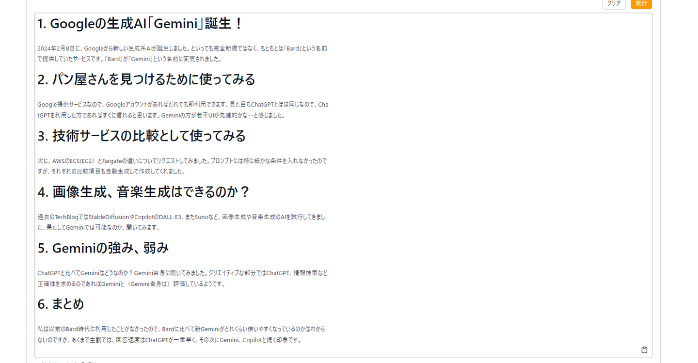 WEBページを要約してくれる機能です。WEBで公開されているマニュアルや記事を簡潔に要約してくれるので利用の機会は多いかと思います。例えば前回のTechBlog記事「Googleの生成AI「Gemini」を試してみる」のリンクを入れて抽出させてみると以下のように出力されます。結構いいですよね!