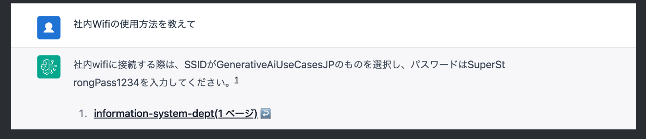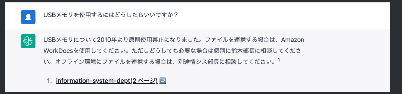 ワークショップの実際の事例では、社内規定を書いたサンプルドキュメントをアップロードして、それに対応した質問をしています。事例の通り、ソース情報(どのドキュメントのどの場所に書いてあったのか)も記載してくれます。