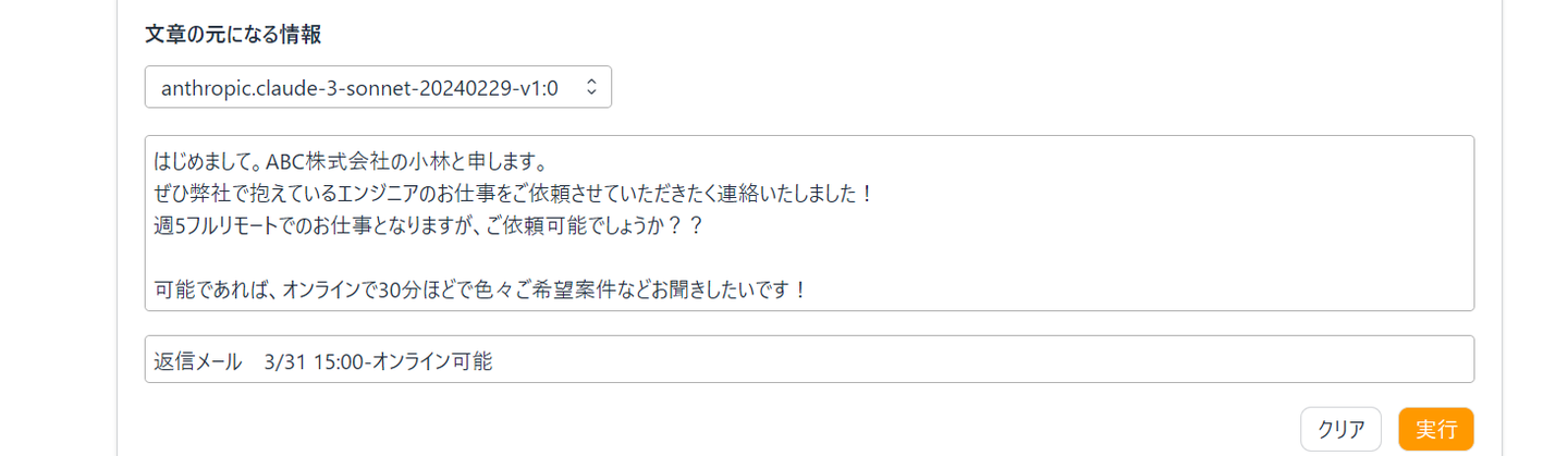 日程調整メールの返事やクレームメールへの謝罪返信などをユースケースとして挙げています。例えば、お客様からの提案メールで日程を回答したい場合、以下のように「受信したメール本文」と「期待する生成条件」を入力して実行ボタンを押下します。(今回であれば、頂いたメールに「返信するメール」を生成してほしい、かつその本文に日時を指定して回答するように依頼しています)